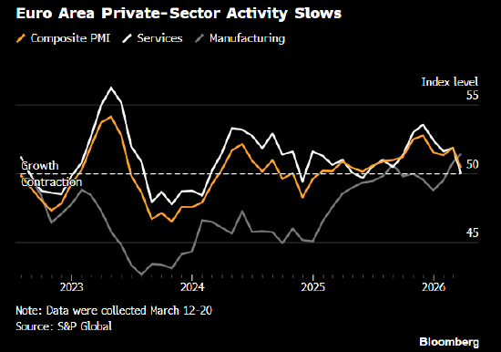 随着伊朗战争推高通胀,并危及刚刚显现的经济复苏势头,欧元区私营部门活动3月录得去年5月以来最慢增速。