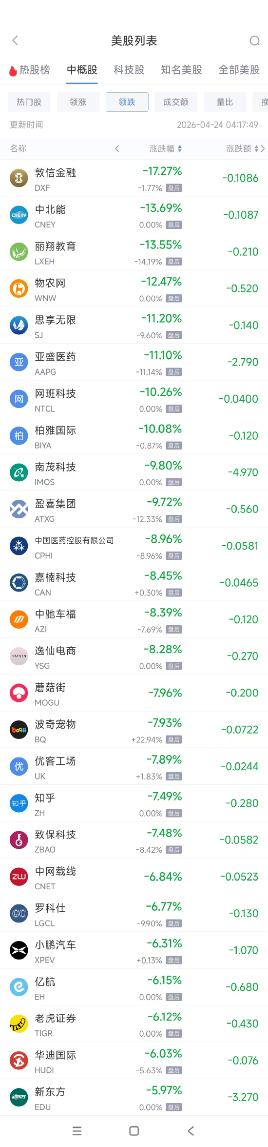 领跌中概股列表: